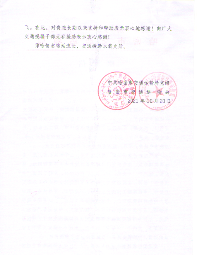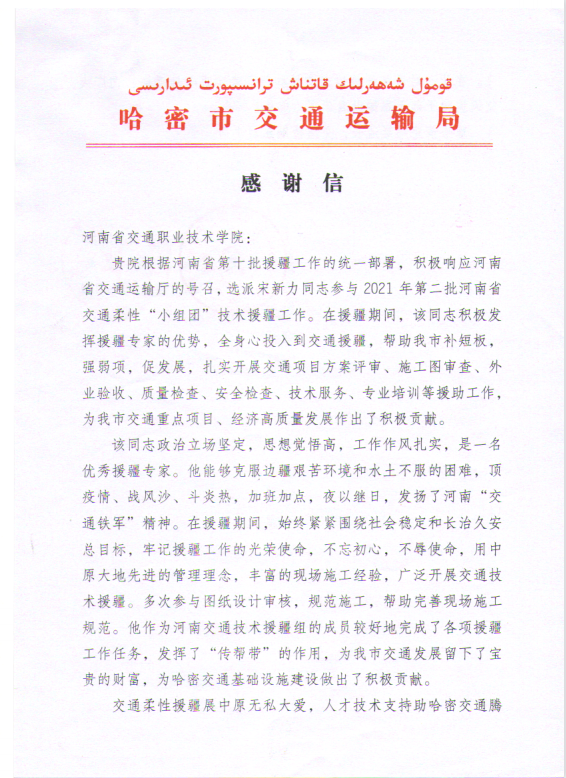 日前,哈密市交通运输局向我校寄来感谢信,向我校在援疆工作中作出的积极贡献表示最衷心的感谢。