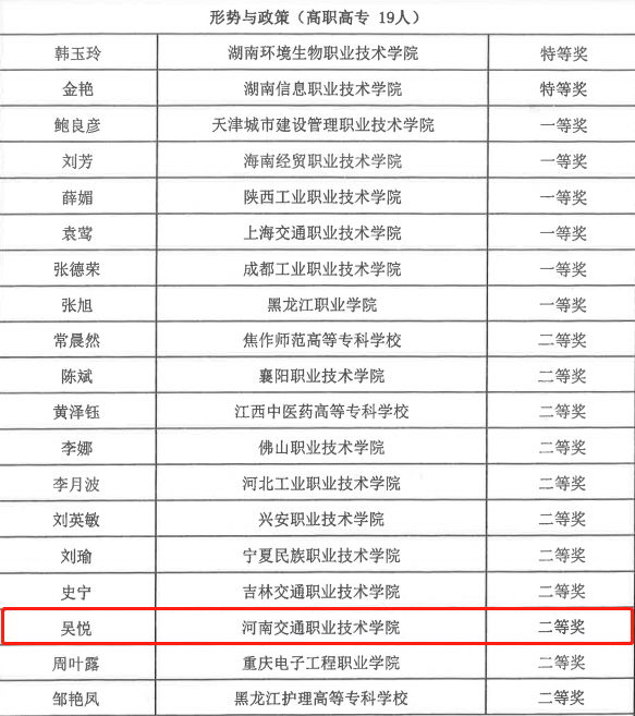 近日,教育部公布了“第二届全国高校思想政治理论课教学展示暨优秀课程观摩活动”评审结果。我校马克思主义学院教师吴悦,经过层层选拔、以扎实的教学功底和精彩的展示,荣获《形势与政策》(高职组)二等奖。