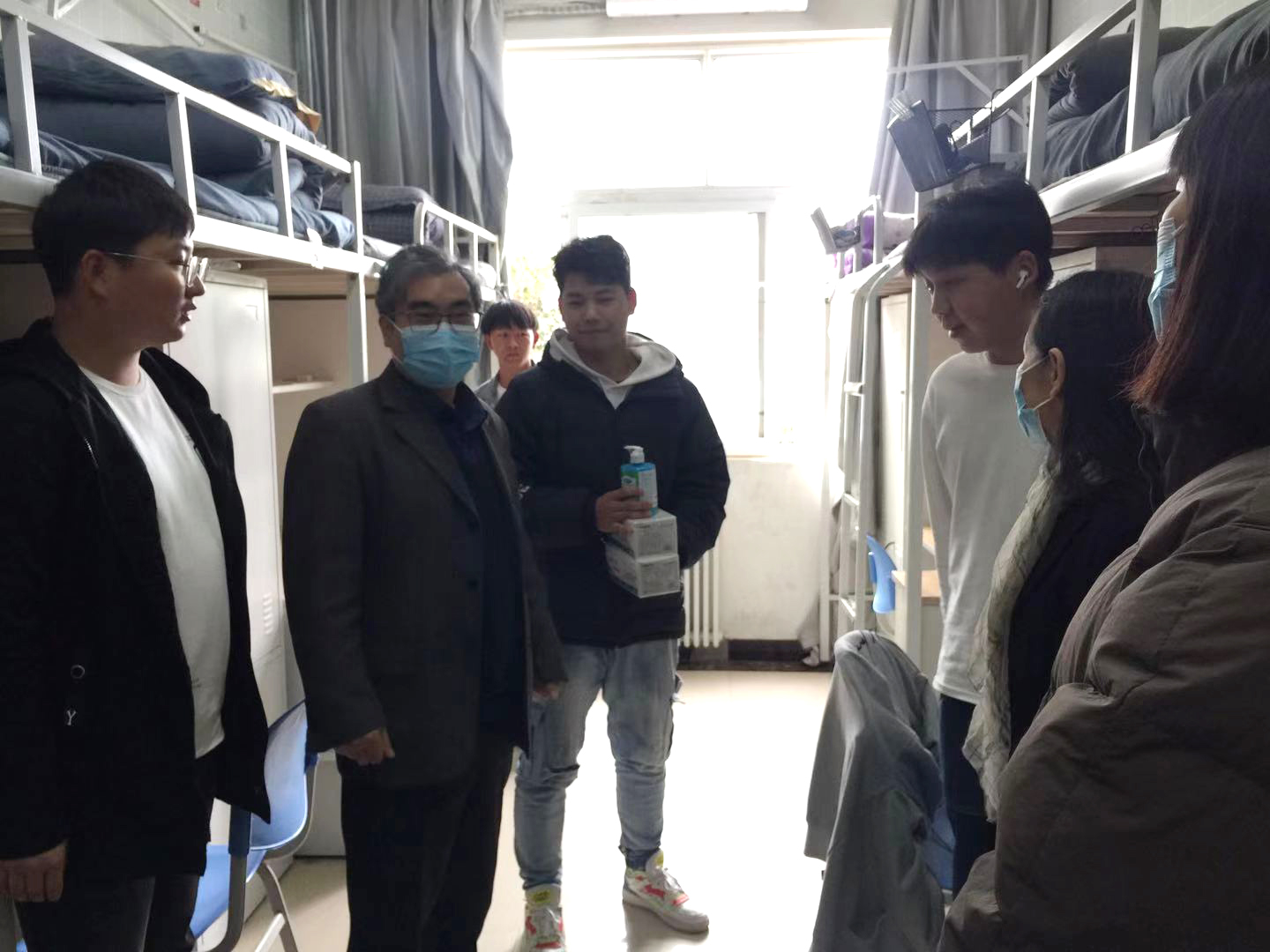 在学生宿舍,夏连学与同学们亲切交谈,详细询问疫情防控期间学生们的思想动态,了解学生对宿舍管理等方面的意见和建议,以及在学习和生活上遇到的困难和问题,并给学生们带来了防疫物品。他叮嘱大家要保持宿舍卫生、强化安全用电意识,鼓励同学们养成良好的生活习惯,努力营造一个安全、卫生、文明、和谐的宿舍环境。