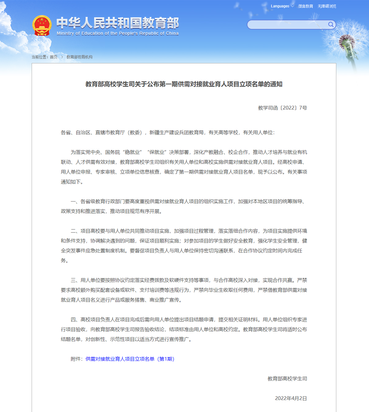 近日,教育部高校学生司发布《关于公布第一期供需对接就业育人项目立项名单的通知》(教学司函【2022】7号),我校与上海亚湾酒店管理有限公司签订的酒店管理与数字化运营专业定向人才培养培训项目,成功入选教育部就业育人项目立项名单。