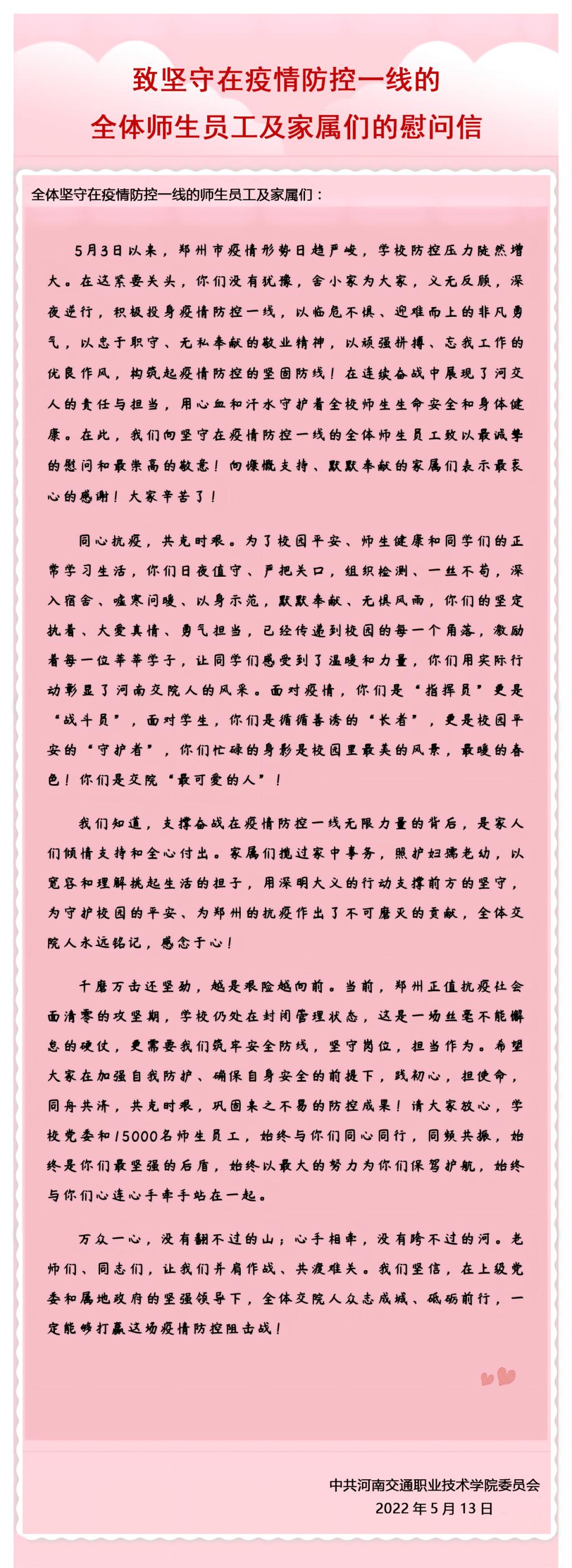 致坚守在疫情防控一线的全体师生员工及家属们的慰问信