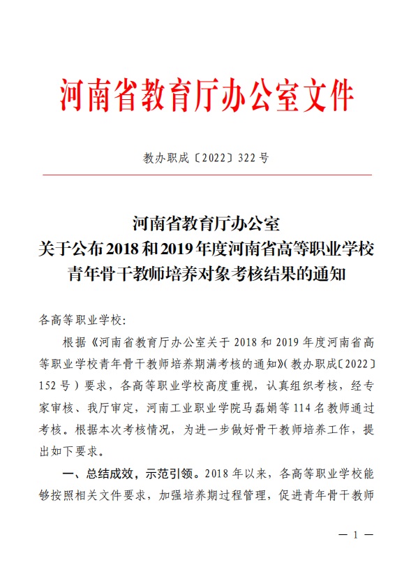 近日,河南省教育厅办公室发布《关于公布2018和2019年度河南省高等职业学校青年骨干教师培养对象考核结果的通知》(教办职成〔2022〕322号),公布全省高等职业学校青年骨干教师培养对象考核结果,我校刘喜要、张杰飞等8名教师顺利通过考核。