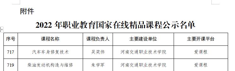 近日,教育部发布《关于2022年职业教育国家在线精品课程遴选结果的公示》。我校《柴油发动机构造与维修》《汽车车身修复技术》2门课程成功获批国家级在线精品课程,成为我校首批国家级精品课程,实现了学校在此项目上的突破。此次认定的职业教育国家在线精品课程是学校持续深化“三教”改革,大力推动教学信息化,全面提升教育教学质量结出的硕果,也是学校推进“双高工程”建设的重要标志性成果。