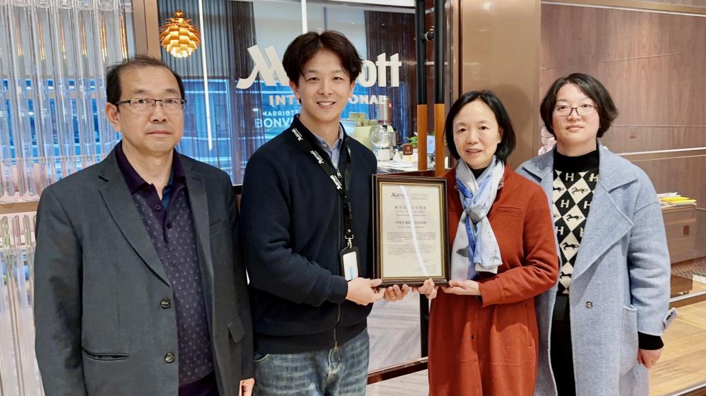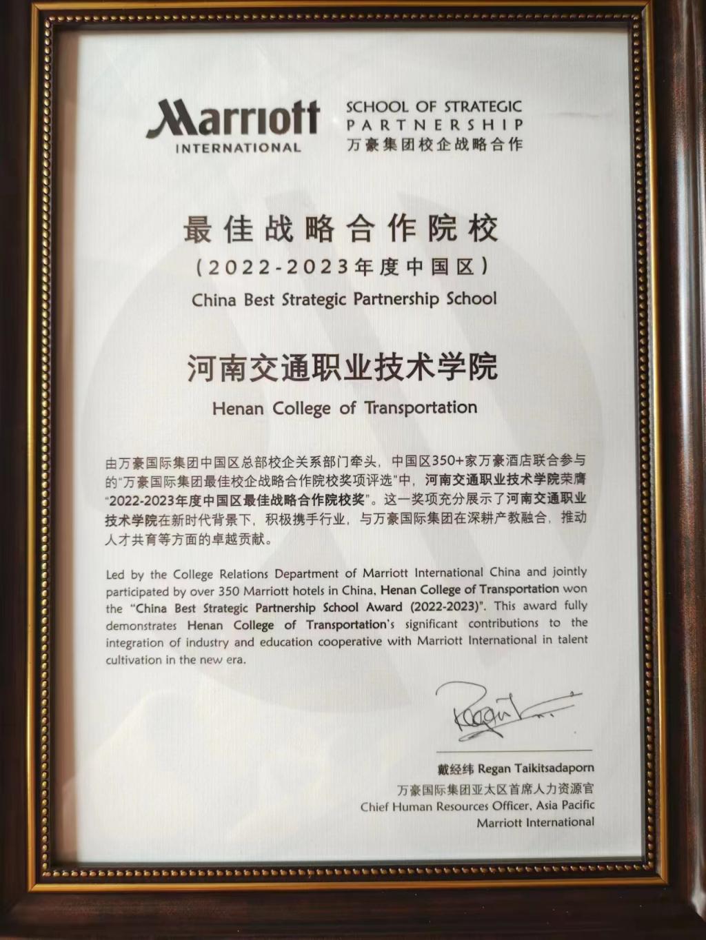 在调研过程中,朱程还代表万豪国际集团向校方颁发了“2022-2023年度中国区最佳战略合作院校奖”(全国总共12所院校获奖)。我校是河南省唯一一所获此殊荣的院校。此奖项由万豪国际集团中国区总部校企关系部门牵头,中国区350+家万豪酒店联合参加的“万豪国际集团最佳校企战略合作院校奖项评选”活动中选出,这一奖项充分展示了我校在新时代背景下,积极携手行业,与万豪国际集团在深耕产教融合,推动人才共育等方面的卓越贡献。