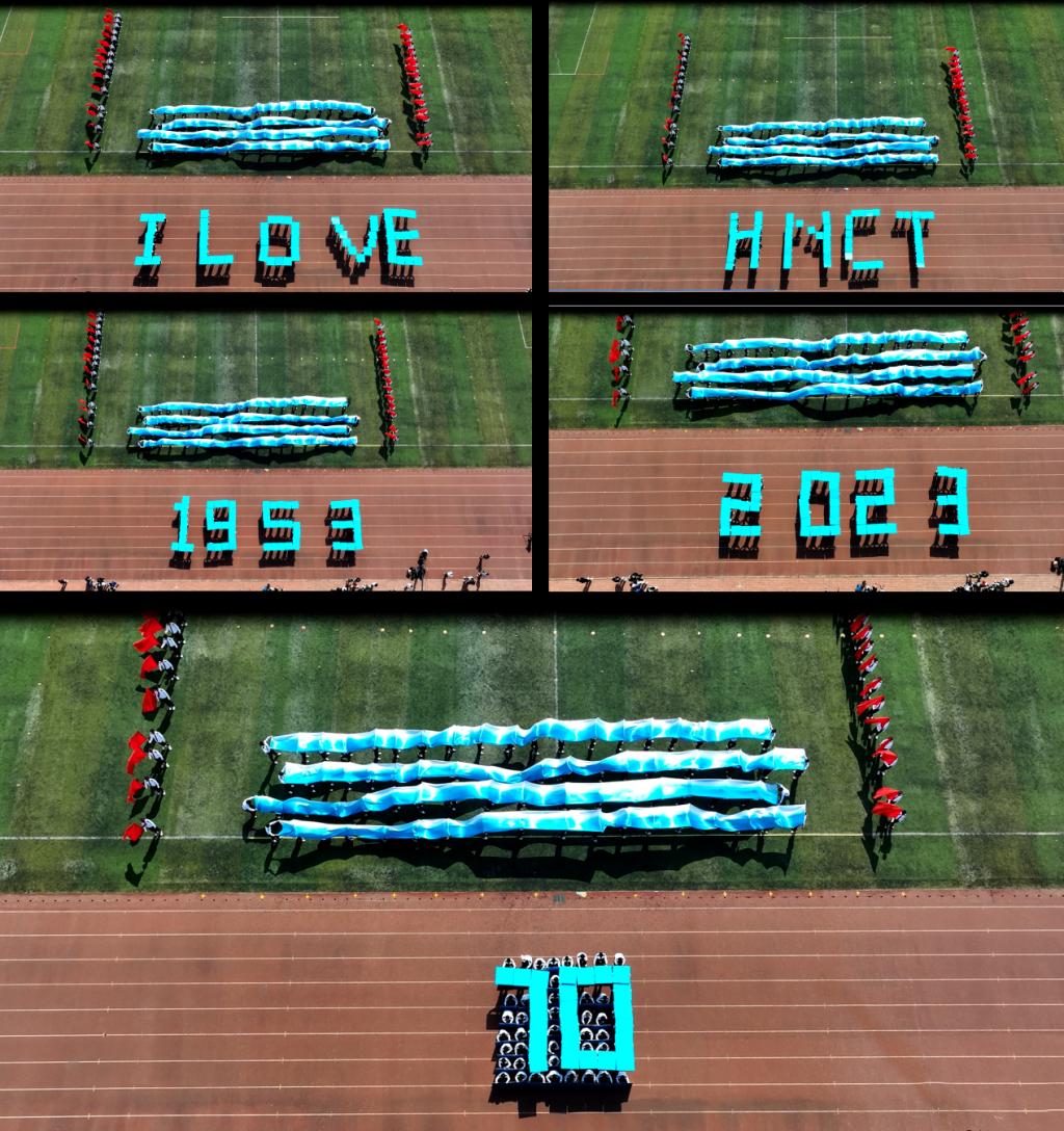 “哇……也太赞了吧!”“他们的队列好整齐啊”……伴随着观众席的阵阵欢呼和称赞,来自9个院系的艺术团体操队伍依次入场展演。现代舞、传统舞、太极拳、健美操、刺杀操……各支队伍身着各式各色服装,将传统文化与现代流行、专业特色与现场展演相融合,用舞蹈和造型尽展青春风采和拳拳心意。其中,汽车学院以翻飞的舞旗幻化出汹涌的波涛和翱翔的雄鹰;公路学院以白衣红扇拼出“中国”字样和中国地图;航运海事系先是用摆出帆船、海鸥、锚等造型,又以“I LOVE HNCT”“1953”“2023”“70”等造型花式告白学校,庆祝学校建校70周年。