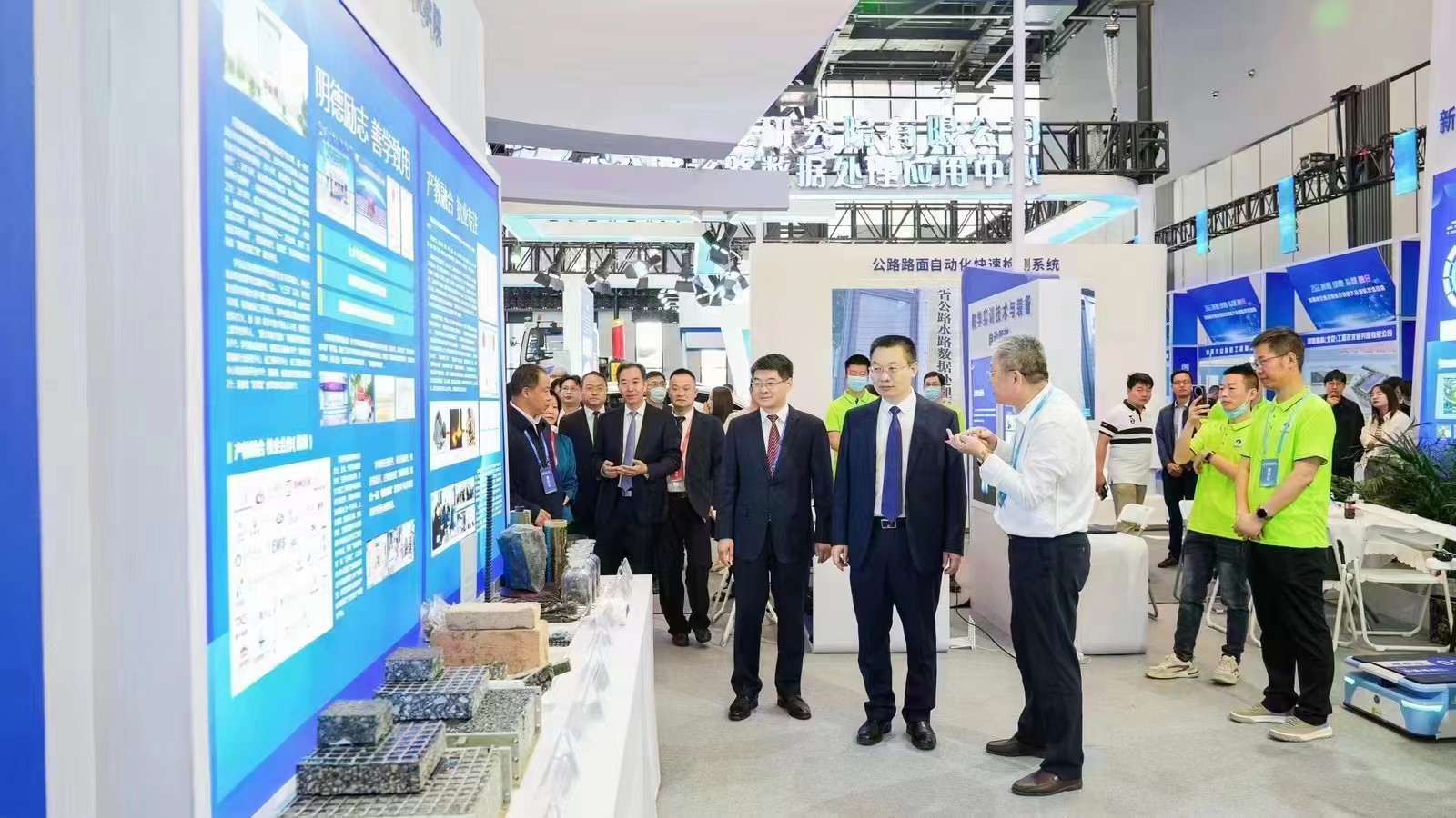 在学校科技创新成果展区内,展出了众多科技创新产品:被誉为“绿色新材料”、“点石成金”的玄武岩纤维应用于高速公路建设,不仅成本降低,而且极大提高了路面的柔韧性、低温抗裂性、抗疲劳性能等路用性能,使用寿命翻了一倍;机器狗具备四足仿生、视觉识别、巡航等功能,能够执行特殊场景下的配送、取送件任务以及物流园区、仓库的巡检任务;无人机可用于道路交通隐患快速排查、道路使用状况巡检相关的理论教学;智能网联无人驾驶汽车能够实现循迹、感知避障、循环路由、自主泊车、车路协同等场景功能。