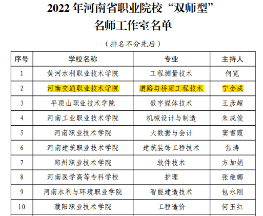 近日,河南省教育厅办公室下发《关于公布2022年河南省职业院校“双师型” 名师工作室和教师技艺技能传承创新平台名单的通知》(教办职成〔2023〕176 号),我校宁金成教授主持的道路与桥梁工程技术专业工作室获批“双师型”名师工作室,这是我校“双师型”教师团队建设取得的又一重大成果。