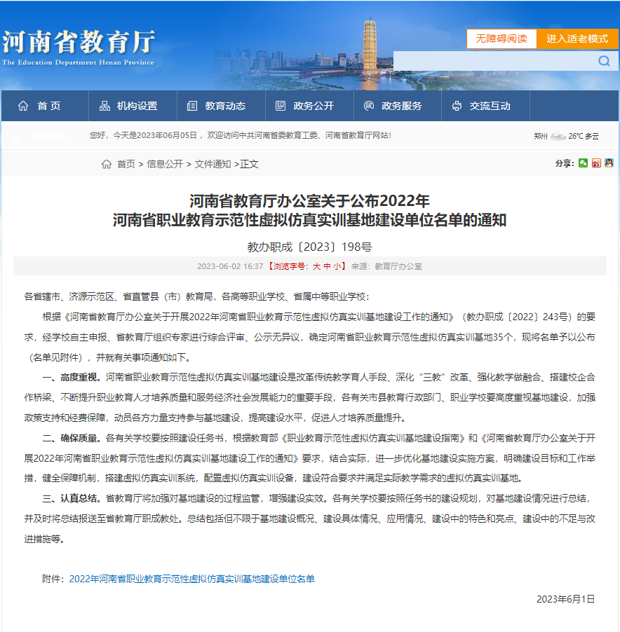 近日,河南省教育厅办公室公布了《2022年河南省职业教育示范性虚拟仿真实训基地建设单位名单的通知》教办职成〔2023〕198号,我校“交通土建施工虚拟仿真实训基地”项目,成功入选省级职业教育示范性虚拟仿真实训基地建设单位名单。