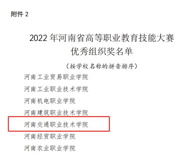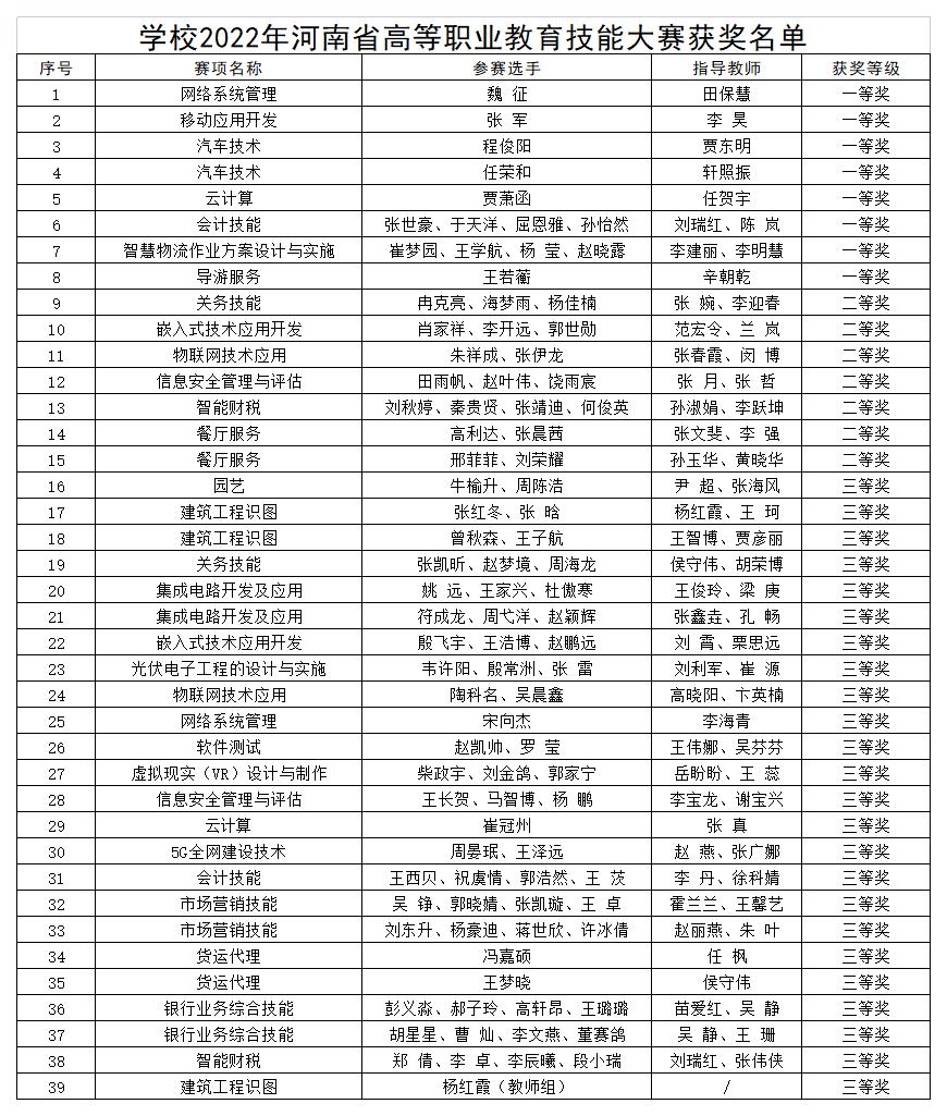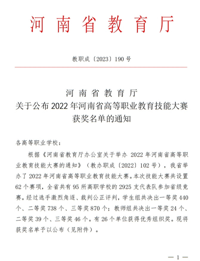 近日,河南省教育厅公布了2022年河南省高等职业教育技能大赛获奖名单(教职成〔2023〕190号),我校代表队表现优异,共获奖39项,其中一等奖8项、二等奖7项、三等奖24项,获奖数量再创新高;同时,学校获得2022年河南省高等职业教育技能大赛优秀组织奖。