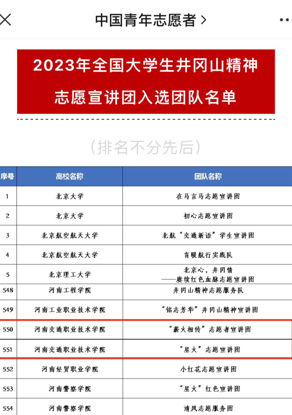 为深入学习宣传贯彻习近平新时代中国特色社会主义思想和党的二十大精神,落实“强国复兴有我”群众性主题宣传教育活动相关要求,动员引导青年学生大力弘扬志愿精神,团中央青年志愿者行动指导中心分别联合全国青少年井冈山革命传统教育基地、井冈山管理局、中国核工业集团有限公司组织开展了2023 年全国大学生井冈山精神志愿宣讲团、全国大学生“两弹一星”精神志愿宣讲团的遴选工作。我校共有四个团队成功入选2023年全国大学生志愿宣讲团。