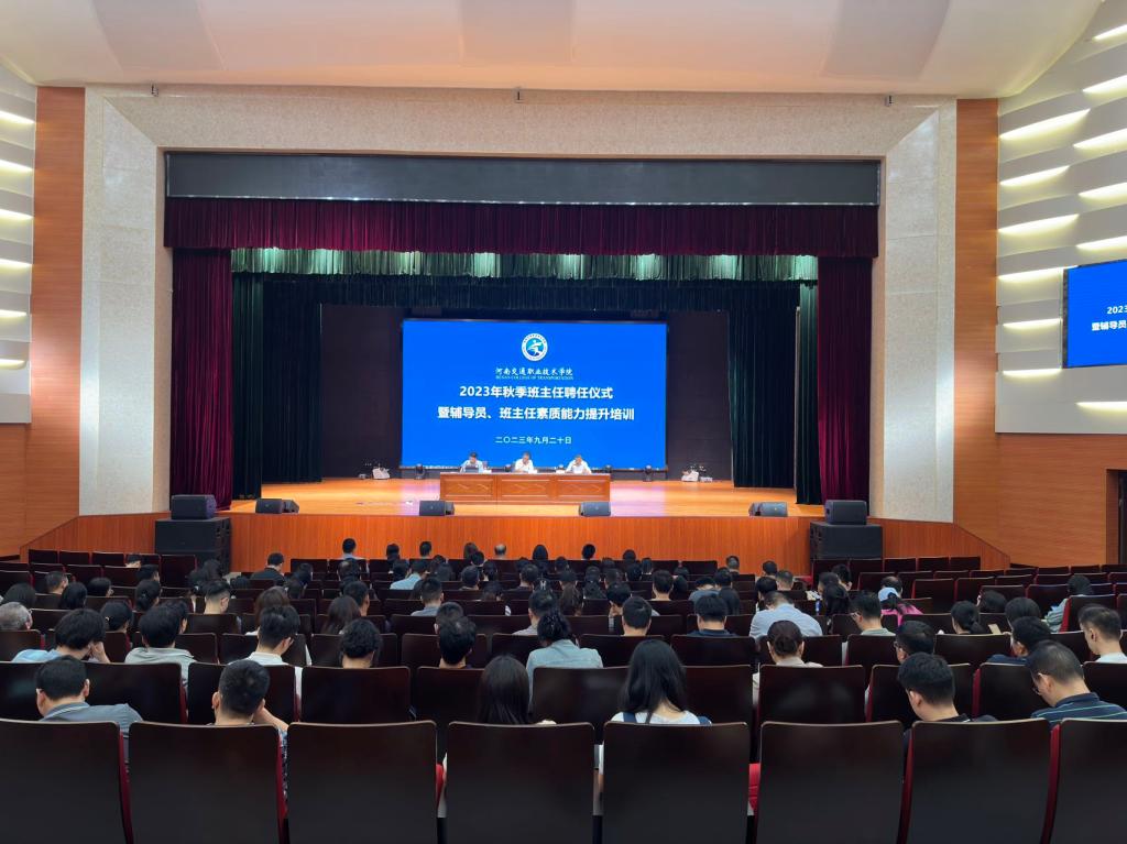 为充分发挥辅导员、班主任在学生教育管理中的作用,提高人才培养质量和学生管理水平,落实立德树人根本任务,9月20日,我校在郑东校区文化艺术中心报告厅举行2023年秋季班主任聘任仪式暨辅导员(班主任)素质能力培训班开班仪式。副校长张瑞春出席会议并讲话,各院(系)领导、组织员、团总支书记、全校辅导员及班主任参加仪式。