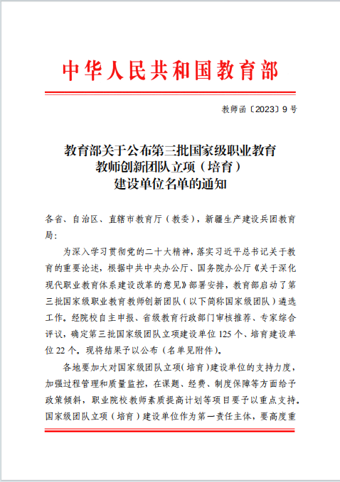 近日,《教育部关于公布第三批国家级职业教育教师创新团队立项(培育)建设单位名单的通知》(教师函〔2023〕9号)公布了第三批国家级职业教育教师创新团队立项建设单位名单,此次共确定国家级职业教育教师创新团队立项建设单位125个,其中河南省有10所高职院校入选,我校“汽车检测与维修技术专业教师团队”成功入选。