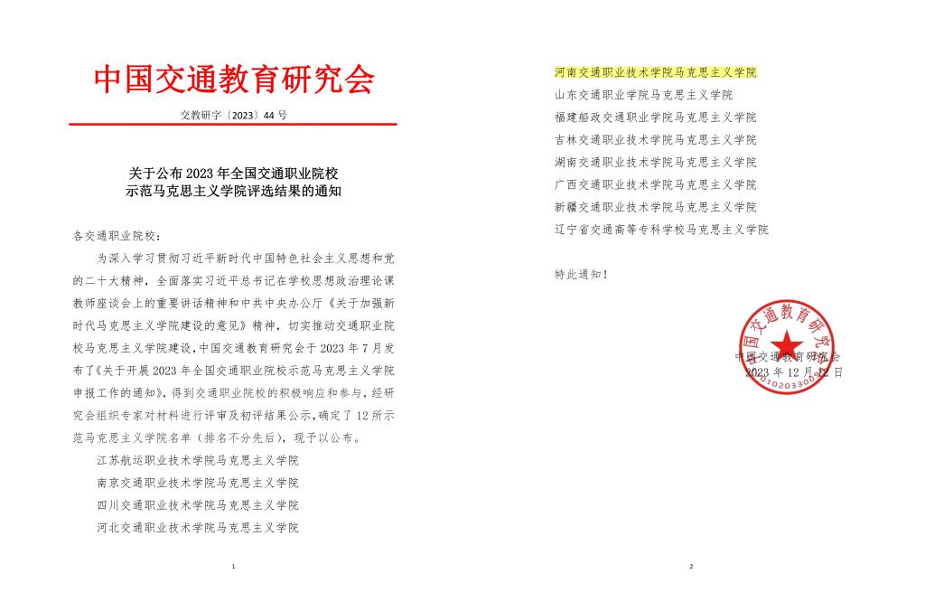 近日,中国交通教育研究会印发《关于公布2023年全国交通职业院校示范马克思主义学院评选结果的通知》(交教研字〔2023〕44号),我校马克思主义学院获评“全国交通职业院校示范马克思主义学院”。