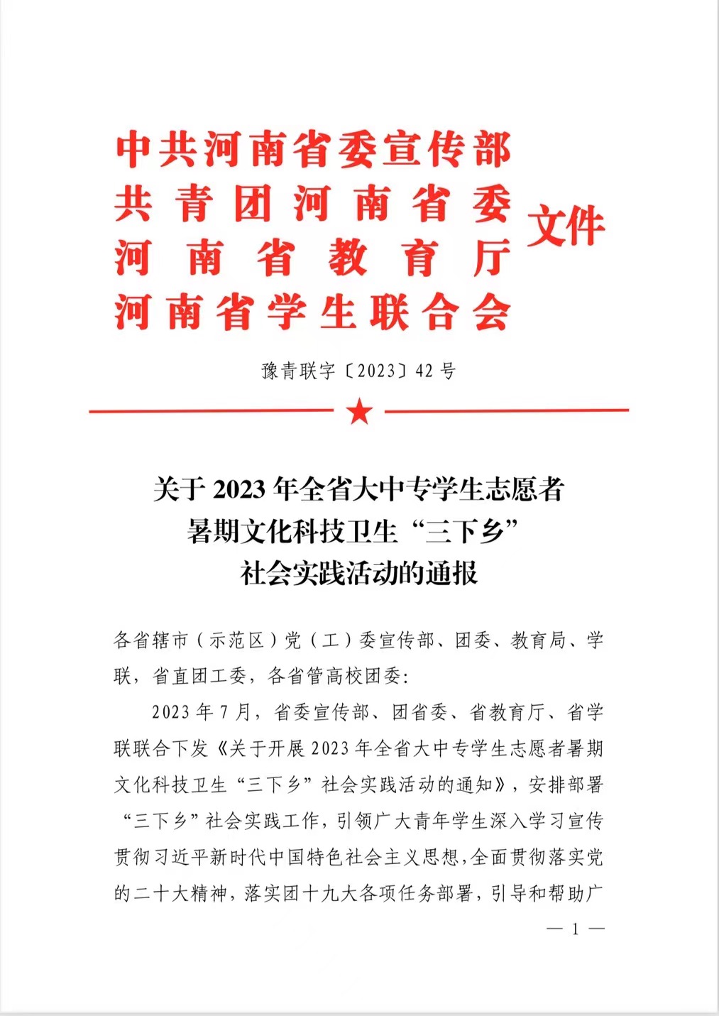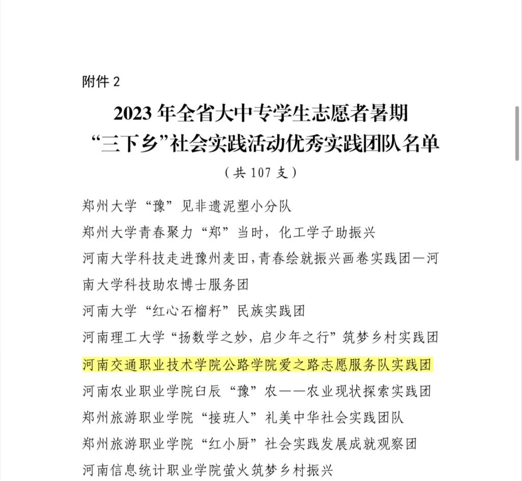 近日,河南省委宣传部、共青团河南省委、河南省教育厅、河南省学生联合会联合印发《关于2023年全省大中专学生志愿者暑期文化科技卫生“三下乡”社会实践活动的通报》。决定对在2023年“三下乡”社会实践活动中表现突出的优秀集体、个人和项目进行通报表扬。我校团委被评为2023年全省暑期“三下乡”社会实践活动优秀单位;公路学院“河南交通职业技术学院公路学院爱之路志愿服务队实践团”被评为2023年全省暑期“三下乡”社会实践活动优秀团队;公路学院程芳老师被评为2023年全省暑期“三下乡”社会实践活动优秀个人。