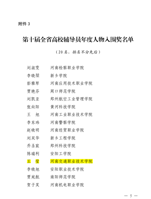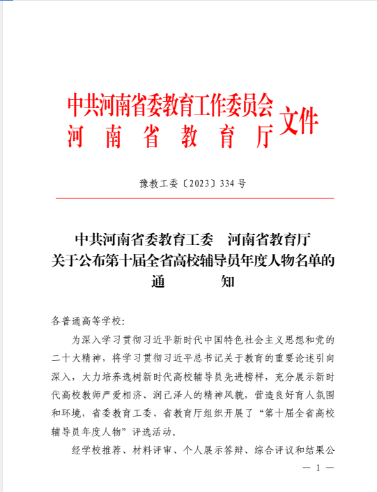 近日,中共河南省委教育工委 河南省教育厅公布了第十届全省高校辅导员年度人物名的通知,我校汽车学院辅导员王莹获“第十届全省高校辅导员年度人物”入围奖。