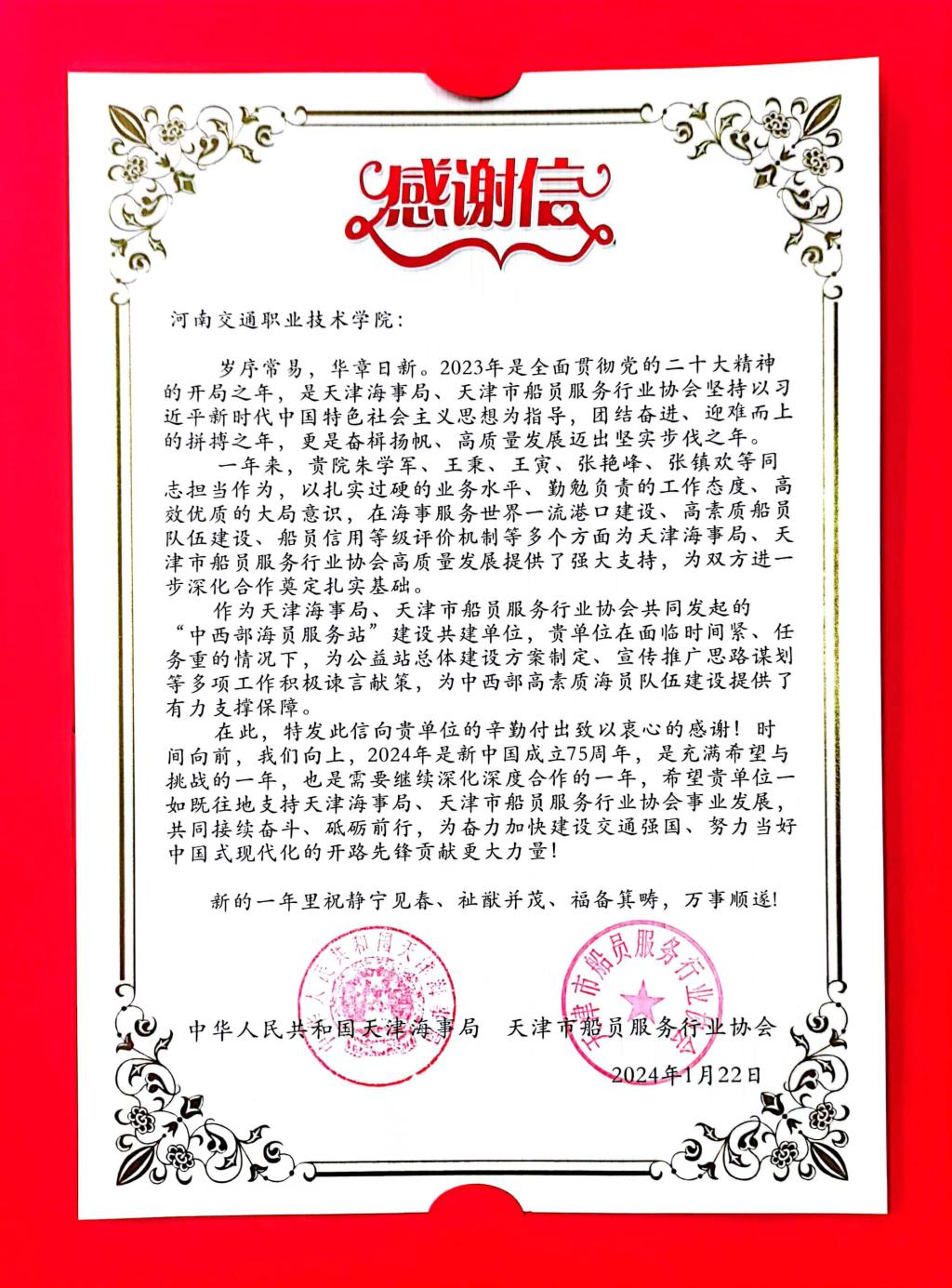 近日,天津海事局、天津船员服务协会向我校寄来感谢信。感谢信中,天津海事局和天津船员服务协会对学校2023年在服务世界一流港口建设、高素质船员队伍建设、船员信用等级评价机制、船员服务行业协会高质量发展等方面做出的努力给予高度评价和认可。