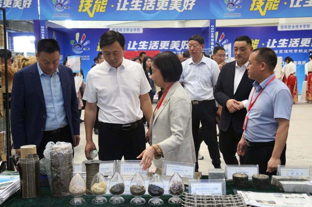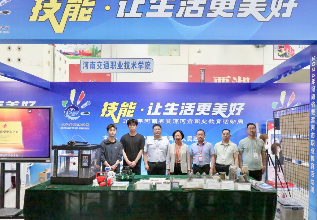 在启动仪式结束后的职业教育成果展示环节,河南交院展位通过展品、多媒体、实物、模型、操作互动等形式展示了我校办学特色,重点展示了学校研发的玄武岩纤维及其制品在交通工程中的最新应用成果、人机对话舞蹈机器人、声控自动驾驶智能小车、语音交互智能座舱等多项在大学生“互联网+”双创竞赛和机器人竞赛中获奖作品。