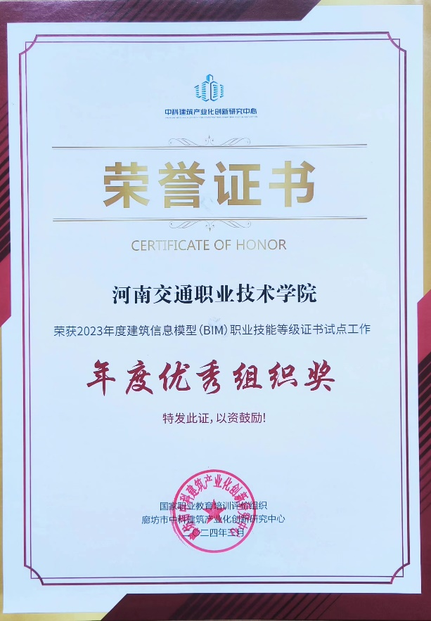 作为全国1+X建筑信息模型(BIM)职业技能等级证书考核授权合作院校,近年来,我校公路学院深入推进“岗、课、赛、证”融通改革实践,2023年度公路学院学生1+X建筑信息模型(BIM)职业技能等级(中级)考证通过率达100%。此次荣誉的取得,是对公路学院1+X建筑信息模型(BIM)职业技能等级(中级)考证工作的认可。