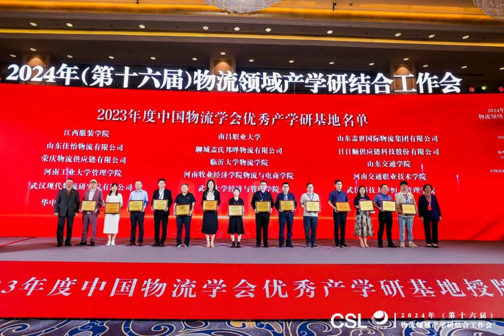 近日,由中国物流学会、中国物流与采购联合会主办的“2024年(第十六届)物流领域产学研结合工作会”在江苏扬州召开。会上,主办方对我校2023年度产学研基地建设予以充分肯定,我校被评为“2023年度中国物流学会优秀产学研基地”并被授予牌匾。