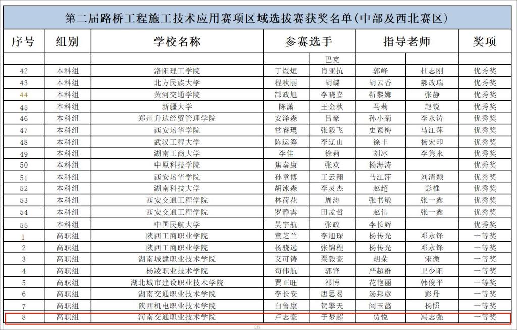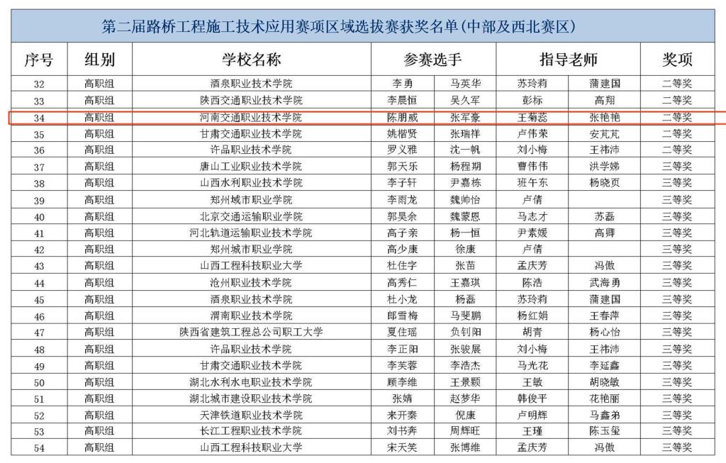 日前,2024一带一路暨金砖国家技能发展与技术创新大赛“第二届路桥工程施工技术应用”赛项区域赛(中部及西北赛区)获奖名单正式公布,我校公路学院学生卢志豪、于梦超荣获中部及西北赛区一等奖,顺利进入决赛。陈朋威、张军豪两位同学荣获中部及西北赛区二等奖。贾悦、冯志强、王菊蕊、张艳艳四位老师荣获“优秀指导教师”。