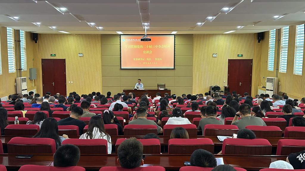 9月18日下午,学校在行政楼一楼报告厅召开学习贯彻党的二十届三中全会精神宣讲会,党委副书记、校长焦宏涛作宣讲报告。学校全体领导班子成员,全体中层干部,各党总支书记、党支部书记,全体辅导员,马克思主义学院全体教师,部分学生代表参加宣讲报告会。党委副书记李菡主持宣讲会。