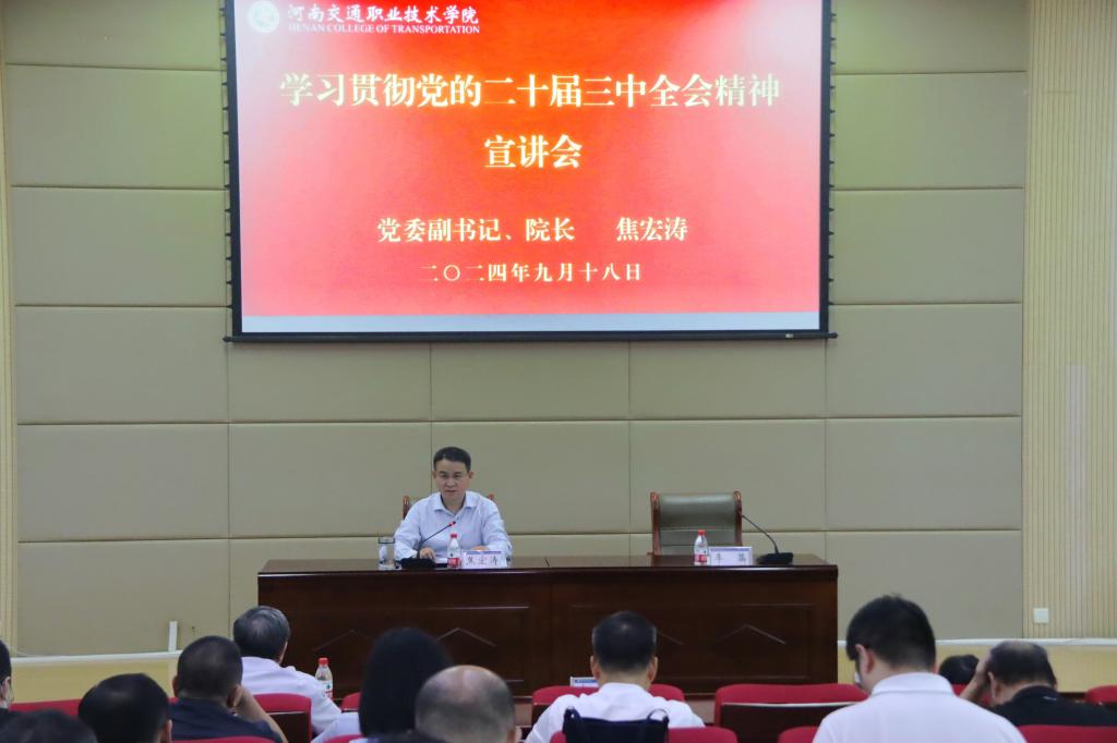 焦宏涛围绕深刻领悟党的二十届三中全会的重大意义、深入学习领会习近平总书记在党的二十届三中全会上的重要讲话精神、全面准确理解《中共中央关于进一步全面深化改革、推进中国式现代化的决定》(以下简称《决定》)提出的进一步全面深化改革重大举措、准确把握全会关于深化职业教育综合改革的新部署新任务新要求、学校如何学习宣传贯彻全会精神等方面进行了系统阐述和深入解读。