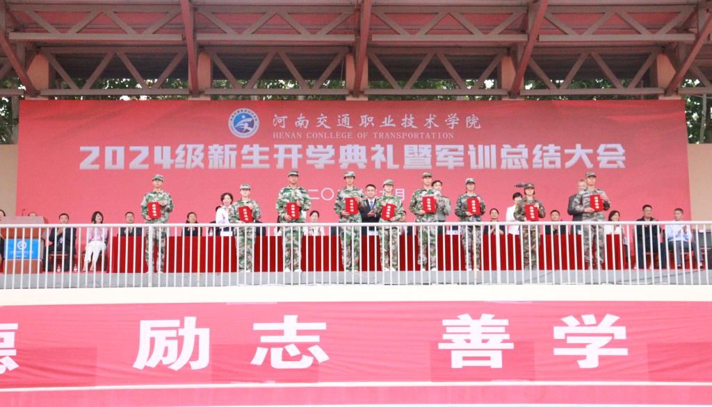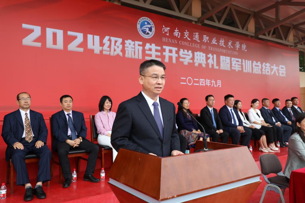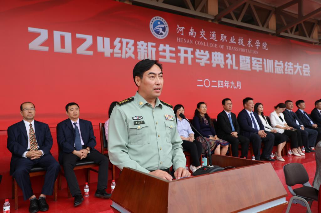 校长焦宏涛代表学校全体师生,向加入河南交院这个大家庭的6640名新同学表示热烈的欢迎,向广大军训教官、教师职工表示衷心的感谢,希望同学们铭记厚德爱国,做勇担使命的追梦者。把个人成长与行业产业发展需要相统一,把个人追求与教育强国、交通强国等国家战略相统一,把个人价值实现与中国式现代化建设伟大事业相统一,将爱国情、强国志、报国行融入青春梦想,以青春“小我”书写强国“大我”。坚持脚踏实地,做知行合一的力行者。在课堂学习中打牢知识基础,在实训竞赛中练就专业本领,在体育运动中强健身体,在劳动实践和社团活动中陶冶情操,不断在实践磨练中求得真学问,练就真本领,书写技能强国、制造强国、交通强国、人才强国的青春誓言。弘扬工匠精神,做技能成才的奋进者。在学习中工作中做到执着专注、精益求精、一丝不苟、追求卓越,以大国工匠对精湛技艺的极致追求为榜样,不断在实践中壮筋骨、长才干,为中国式现代化贡献青春力量。