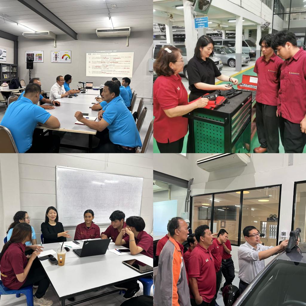 组团在泰期间,还考察了部分中资企业生产基地和销售、服务中心,并对企业维修人员开展了技术培训。在考察广汽埃安泰国生产基地和泰国东方科技学院比亚迪产业学院时,与企业管理人员和技术骨干进行了深入交流,向其介绍了代表国际新能源汽车发展方向的中国方案,并在广汽埃安泰国生产基地设立了河南交院海外工坊;在深入考察了广汽埃安和比亚迪汽车在春武里的多家销售及售后服务中心时,针对其在生产经营过程当中存在的问题和基本需求,现场对服务中心的售后服务人员进行技能培训和指导。