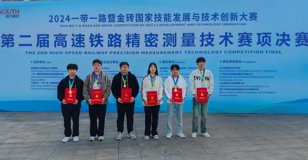 近日,2024“一带一路”暨金砖大赛之第二届高速铁路精密测量技术赛项在武汉铁路职业技术学院举办。来自全国78支参赛队234名参赛选手参加比赛。我校教师王政、夏苗苗指导的参赛选手刘硕、李晏旭、娄明月三位同学和万拥军、尹楠指导的参赛选手刘银彬、王业怀、马禄源三位同学从激烈的竞争中脱颖而出,分别获得团体三等奖。