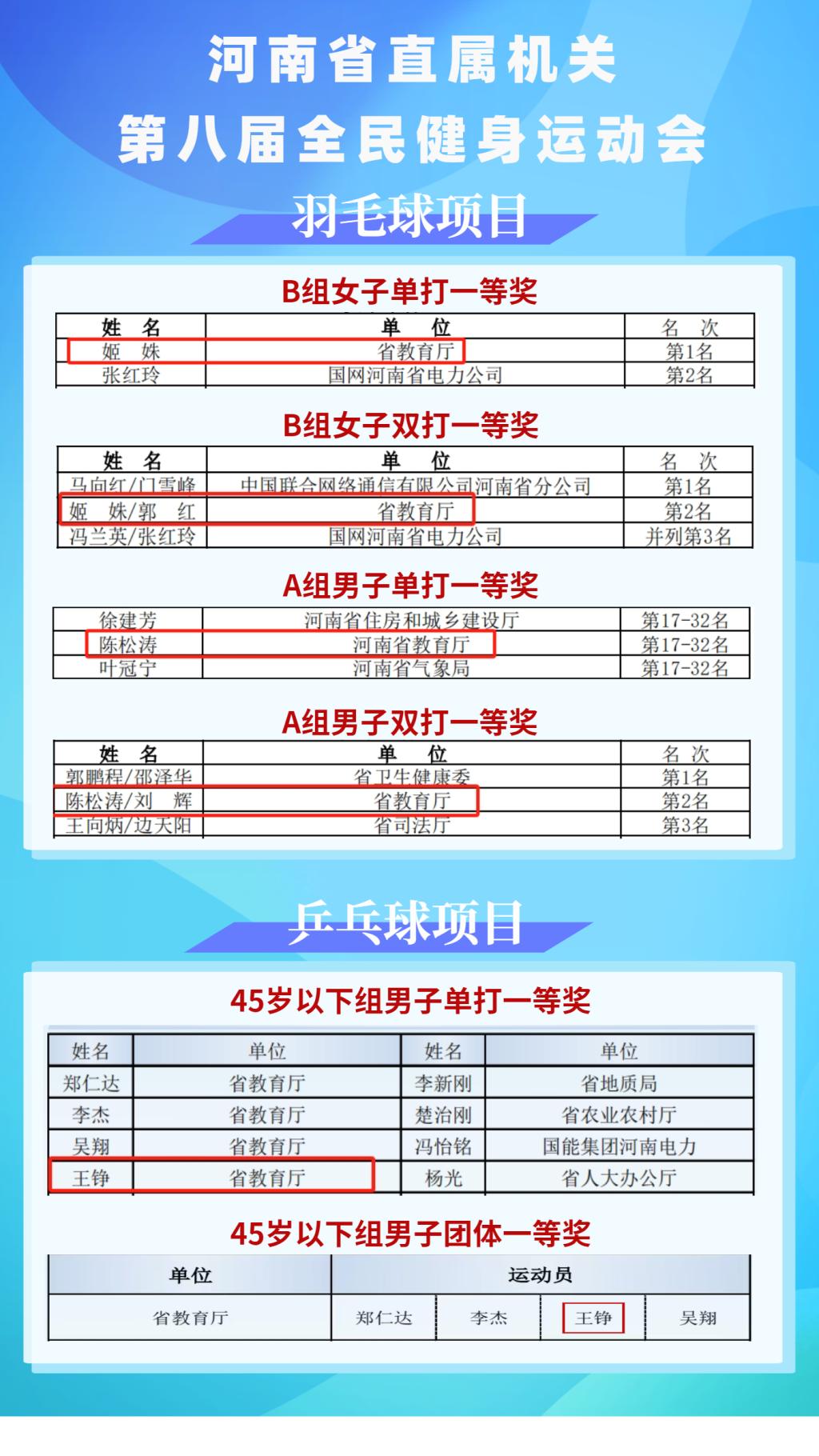 由河南省直工委和省体育局联合主办的河南省直属机关第八届全民健身运动会自10月21日启动以来,代表教育厅参赛的我校代表队捷报频传,多个项目获得好成绩,为我校赢得了荣誉。
