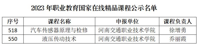 近日,教育部公布了2023年职业教育国家在线精品课程认定结果,我校汽车学院徐增勇和乔丽霞老师主持建设的《汽车传感器原理与检修》《液压传动技术》课程成功入选,体现了学校在数字赋能课程建设以及教育教学改革所取得的新成果。