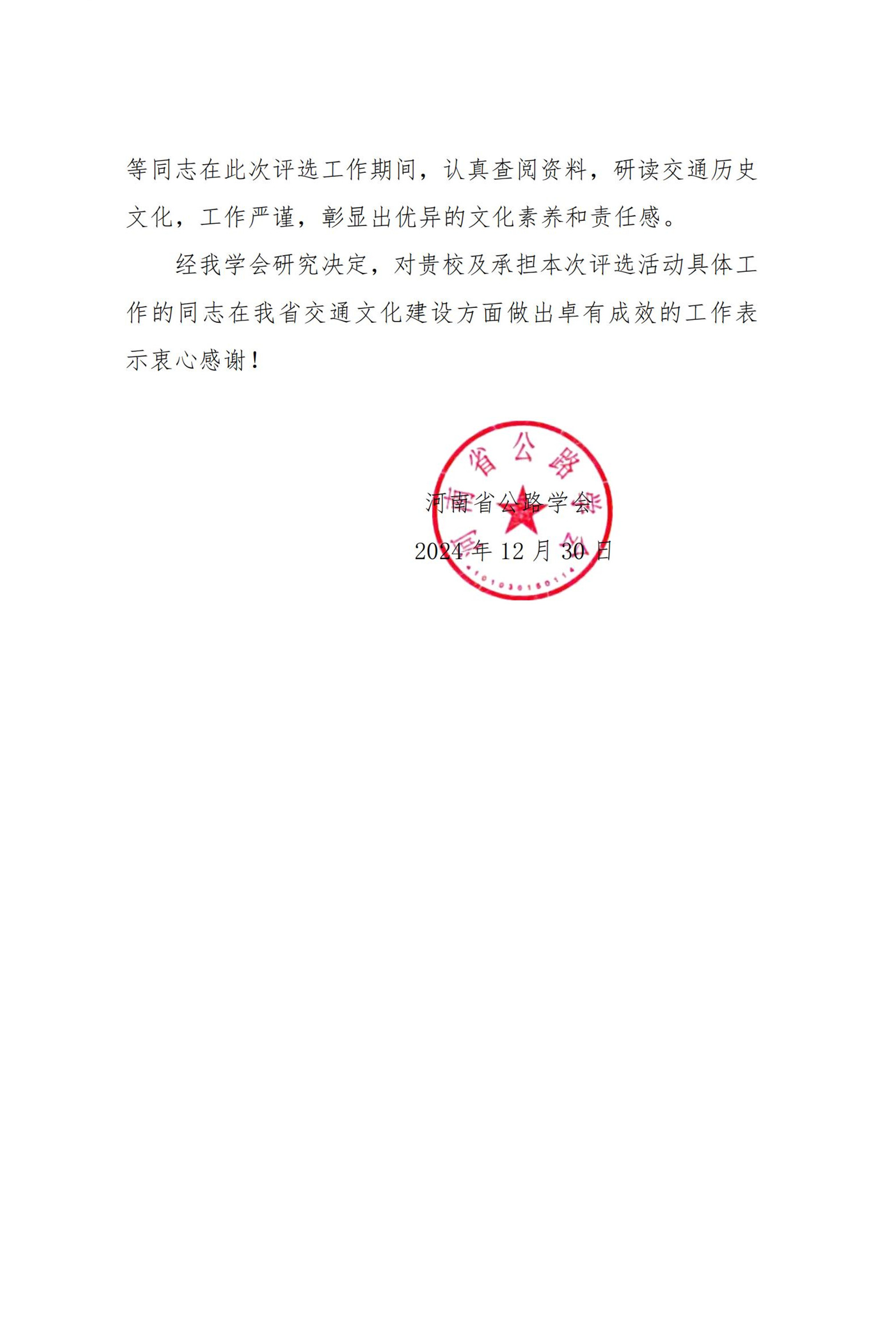 近日,河南省公路学会向我校发来感谢信,感谢我校在全国2024年度“最受欢迎古道”评选活动中所做出的积极贡献。在此次评选活动,我省推荐的太行陉(河南境)、崤函古道、许汝古官道(小商桥)3条古道全部入选,全国共25条入选。