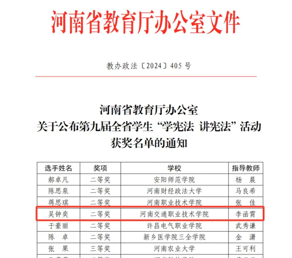 近日,河南省教育厅公布第九届全省学生“学宪法 讲宪法”活动获奖名单,我校吴钟奕同学在演讲比赛中勇夺高校组大赛二等奖。