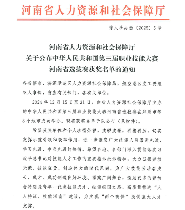 本次大赛以“人人奋勇争先,出彩技能河南”为主题,由河南省人力资源和社会保障厅主办,为省级专项竞赛,涵盖多个技能领域,旨在选拔优秀技能人才。