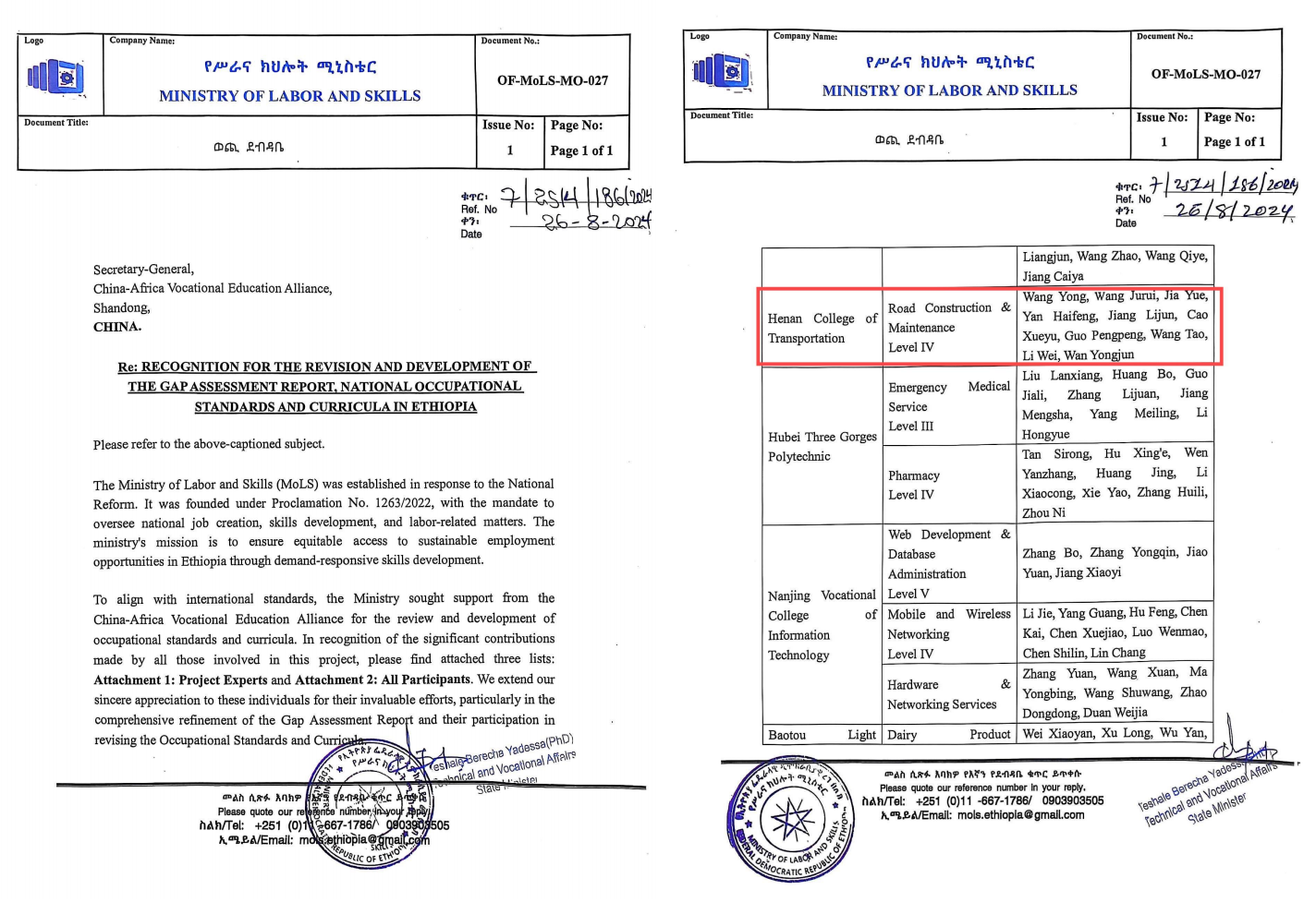 近日,学校收到埃塞俄比亚劳工与技能部的官方文件,文件明确由河南交通职业技术学院牵头建设的埃塞俄比亚国家职业标准开发项目被正式纳入埃塞俄比亚的职业技术与教育培训(TVET)体系,将在埃塞俄比亚工程建设中广泛推广。
