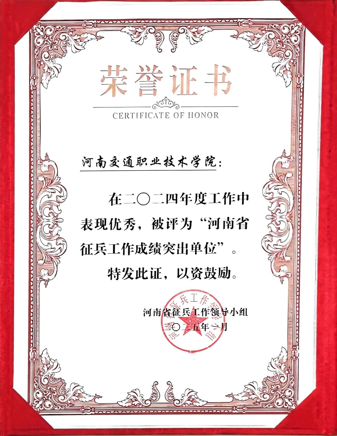 近日,学校被河南省征兵工作领导小组授予“2024年度河南省征兵工作成绩突出单位”荣誉称号,同时被二七区人民武装部评为“2024年度征兵工作先进单位”。