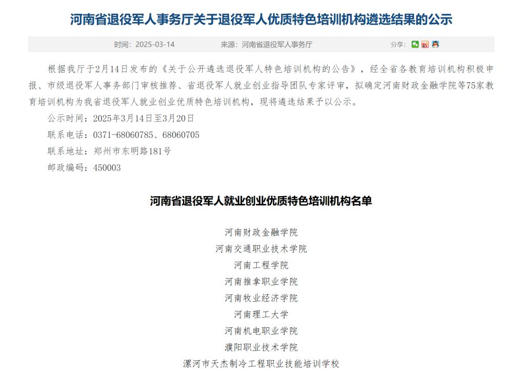 为进一步优化我省退役军人教育培训工作,助力退役军人高质量就业,近日河南省退役军人事务厅面向全省公开遴选 “河南省退役军人优质特色培训机构”。全省共有75家企业、大中专院校获批,我校成功入选。