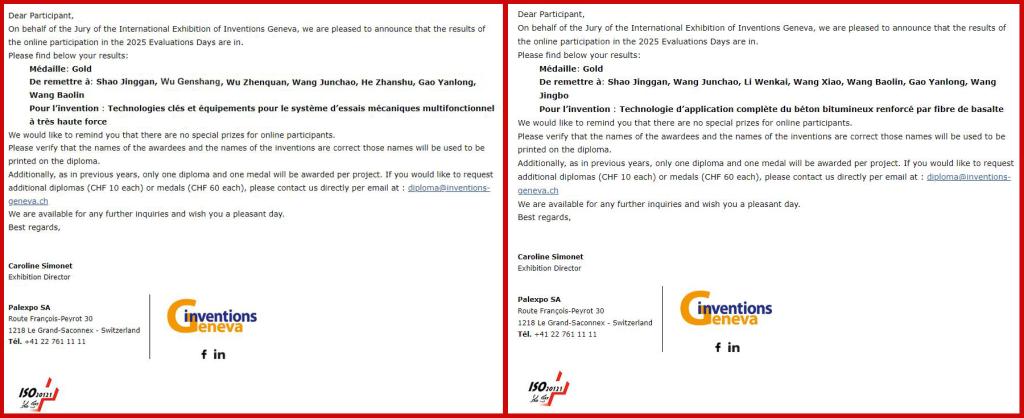 日前,第50届日内瓦国际发明展公布获奖名单,由河南交通职业技术学院与校属企业——河南交院工程技术集团有限公司(以下简称交院技术集团)共同主导研发的“超大力值多功能力学试验系统关键技术与装备”与“玄武岩纤维沥青路面成套应用技术”两项核心专利成果,在全球40多个国家及地区超过1000个参展项目中脱颖而出,双双荣获金奖,实现学校在国际顶级科技舞台上的新突破。
