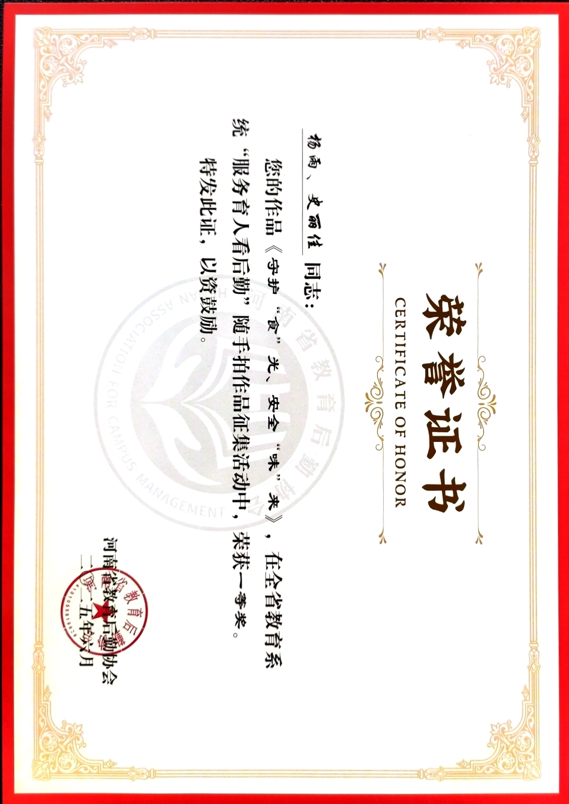 近日,河南省教育后勤协会公布全省教育系统“服务育人看后勤”随手拍活动结果,学校后勤服务集团选送的作品获一等奖1项、三等奖1项。