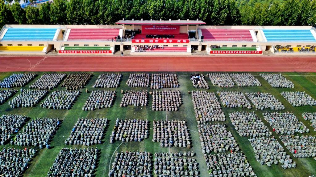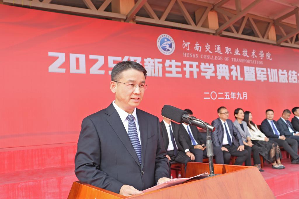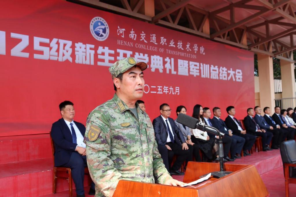 校长焦宏涛代表学校全体师生,向2025级新同学表示热烈欢迎,向军训教官、辅导员、班主任表示衷心感谢。他充分肯定了军训成果,为大家的精彩表演点赞,希望全体新同学尽快融入具有光荣历史、人才辈出的河南交院,带着军训淬炼的拼搏精神和刚毅作风,在学校这片沃土,挺膺担当,厚植家国情怀;崇德修身,筑牢成长之基;勤学苦练,练就过硬本领;学以致用,涵养工匠之魂,将“明德、励志、善学、致用”的校训刻在心间,化为行动。以“明德”为舵,修身正己,涵养品格;以“励志”为帆,志存高远,勇担使命;以“善学”为桨,勤勉不辍,练就本领;以“致用”为舟,知行合一,努力成长为德技并修、全面发展的优秀人才,为加快建设教育强国、交通强国贡献自己的青春力量。