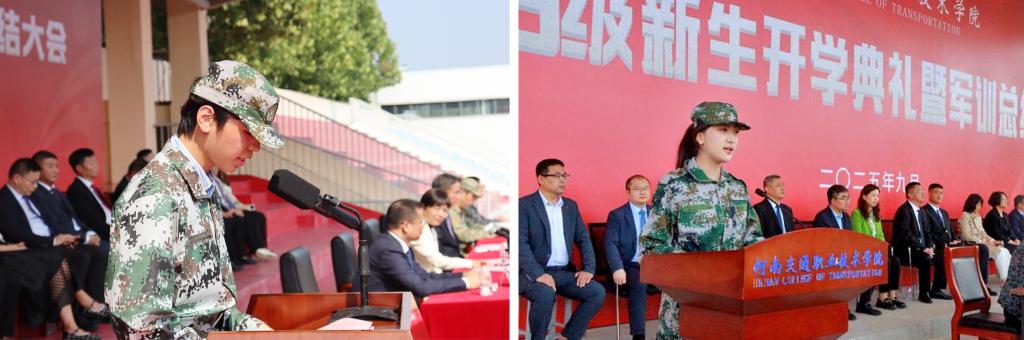 新生代表公路学院张治豪同学、商务旅游系张依冉同学在发言中表示要积极融入大学生活,在学习中探索真理,在实践中磨砺技能,在奋进中积蓄投身交通强国建设力量。