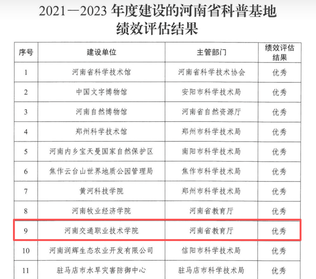 近日,河南省科学技术厅公布2021—2023年度河南省科普基地绩效评估结果,学校“河南高速公路科普基地”获评“优秀”等级,顺利通过评估,并按规定程序自动转为“河南省科普宣教中心”。