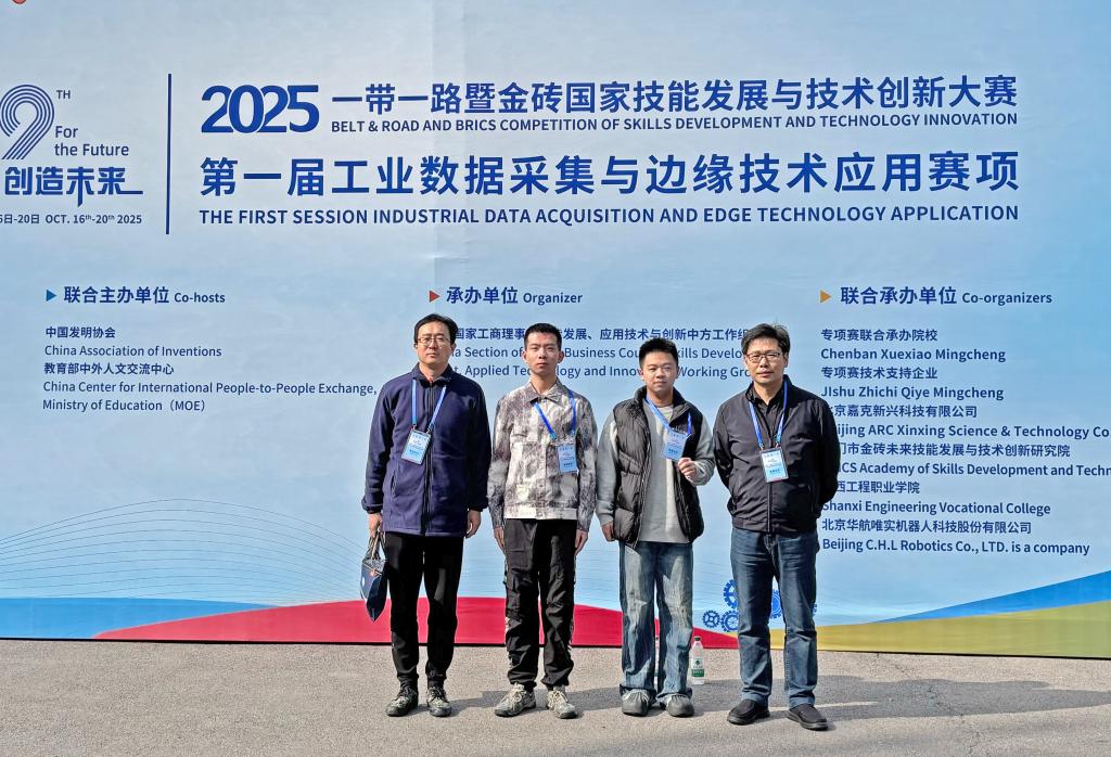 10月17日-10月19日,2025“一带一路”暨金砖国家技能发展与技术创新大赛第一届工业数据采集与边缘技术应用赛项决赛在山西工程职业学院圆满收官。学校教师郭虎锋、刘利军与学生崔旭博、周义翔分别在职工组和学生组荣获三等奖,为学校争得荣誉。