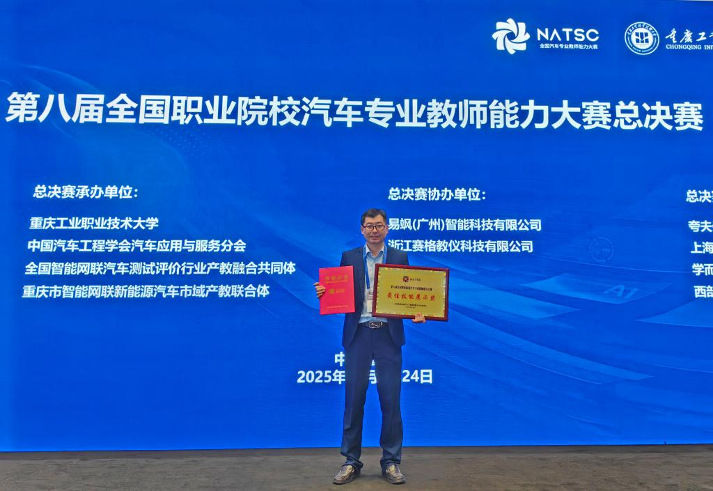 近日,第八届全国职业院校汽车专业教师能力大赛总决赛在重庆圆满落幕。学校汽车学院教师郭彬凭借扎实的专业技能与出色的现场表现,在课程思政专项赛中斩获全国金奖,同时获评总决赛“最佳技能展示奖”。
