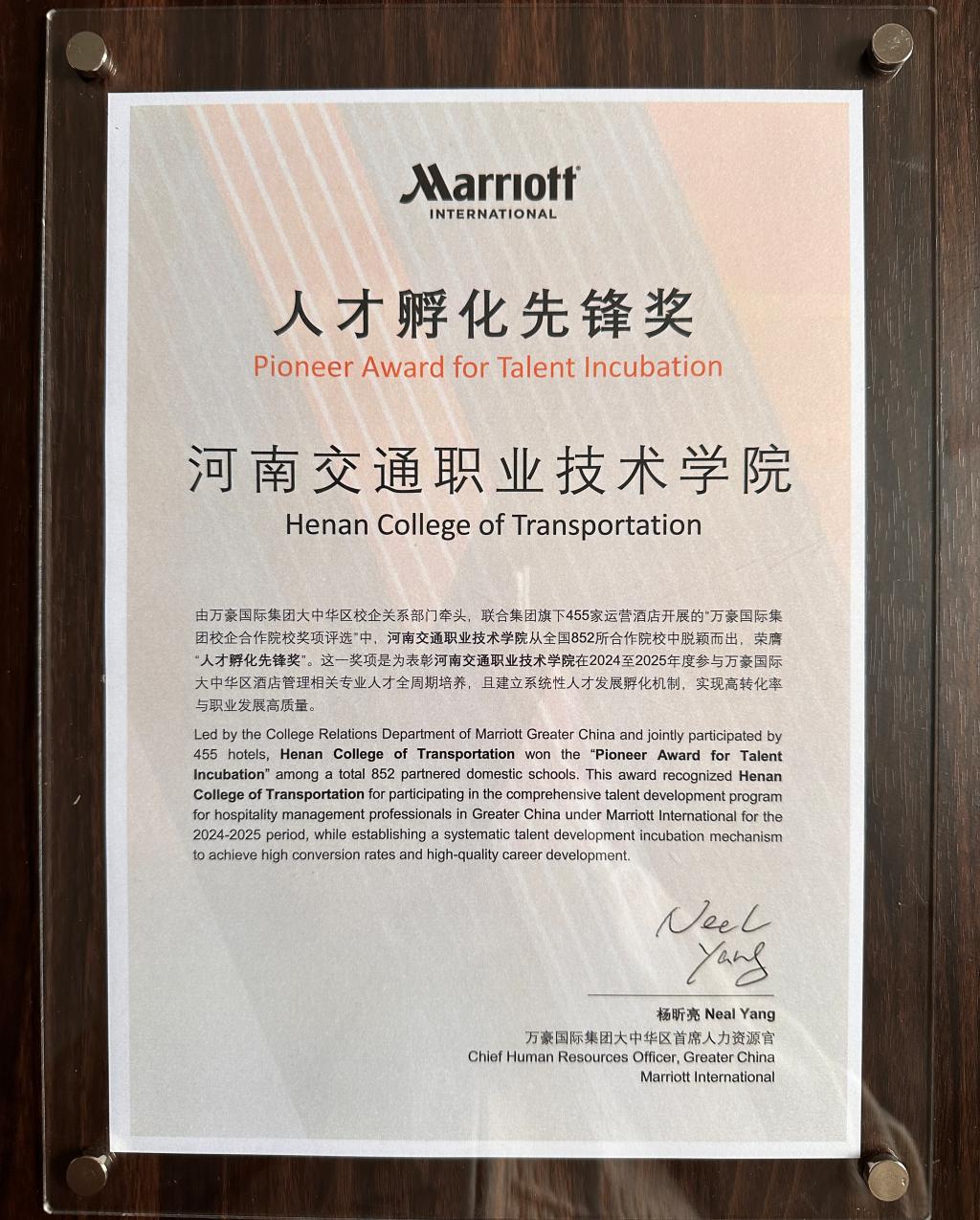 学校荣膺万豪国际集团2024-2025年度“人才孵化先锋奖”