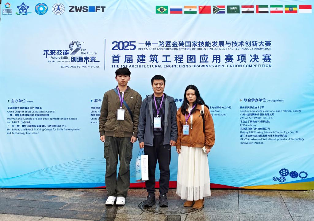 11月6日—9日,2025“一带一路”暨金砖国家职业技能大赛首届建筑工程图应用赛项决赛在贵州航天职业技术学院举行。本次赛事共吸引全国90所院校的110支队伍参加,学校建筑工程系教师郭琦、王智博荣获教师组二等奖,学生李倩倩、冯子淇荣获学生组三等奖。