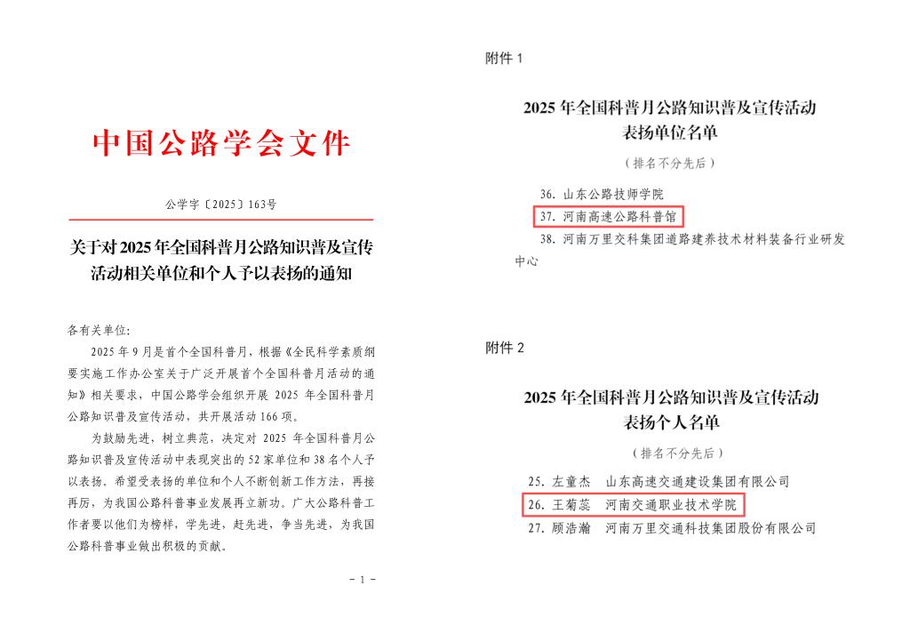 11月28日,中国公路学会对2025年全国科普月公路知识普及宣传活动中表现突出的52家单位和38名个人予以通报表扬。学校河南高速公路科普馆成为我省获表扬的两个场馆之一,公路学院教师王菊蕊同时受到个人表扬。这是我省科普阵地建设的又一优秀典范。