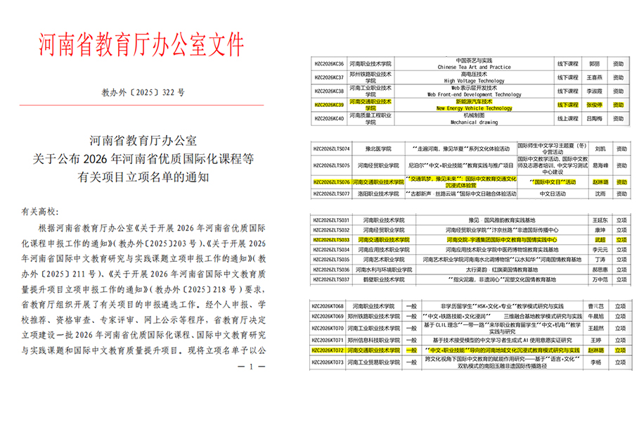 近日,河南省教育厅发布《关于公布2026年河南省优质国际化课程等有关项目立项名单的通知》,学校4个项目成功入选,覆盖优质国际化课程、国际中文教育研究课题、国际中文教育质量提升及实践活动项目四大领域。