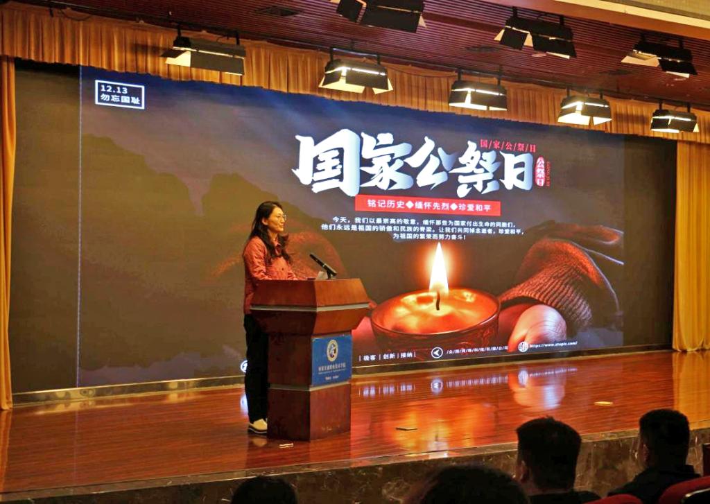 王玮向大家讲述了国家公祭日的由来和南京大屠杀的悲痛历史,并结合现实意义和职业院校的使命担当,对同学们提出期许:大家所学的专业技能是国防大厦不可或缺的基石,大家要将专业技能学习与国防安全需求紧密结合,铭记历史、缅怀先烈、珍视和平、开创未来,肩负起时代的责任与使命,为强国建设民族复兴伟业贡献青春力量。