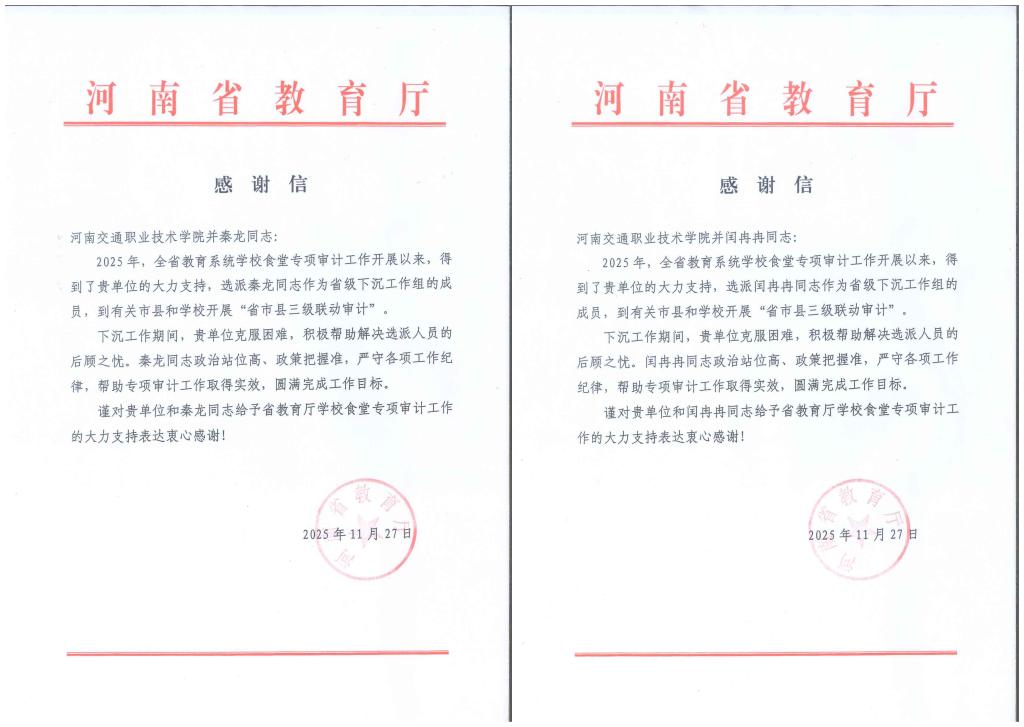 近日,学校收到河南省教育厅发来的感谢信,对学校全力支持2025年全省教育系统学校食堂专项审计工作表示感谢,对学校财务审计处闰冉冉同志、汽车学院秦龙同志在专项工作中的良好表现进行表扬。
